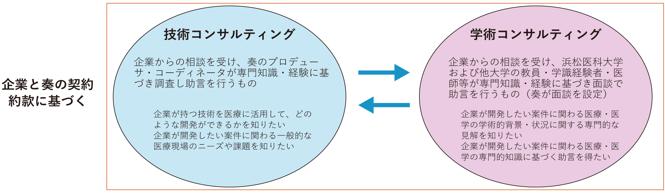 浜松医科大学および他大学の教員・医師・学識経験者が、企業の開発案件に対して学術的な見解・助言を提供します。奏が面談を設定し、専門家との対話を通じて、医学的背景や専門知識に基づく支援を行います。